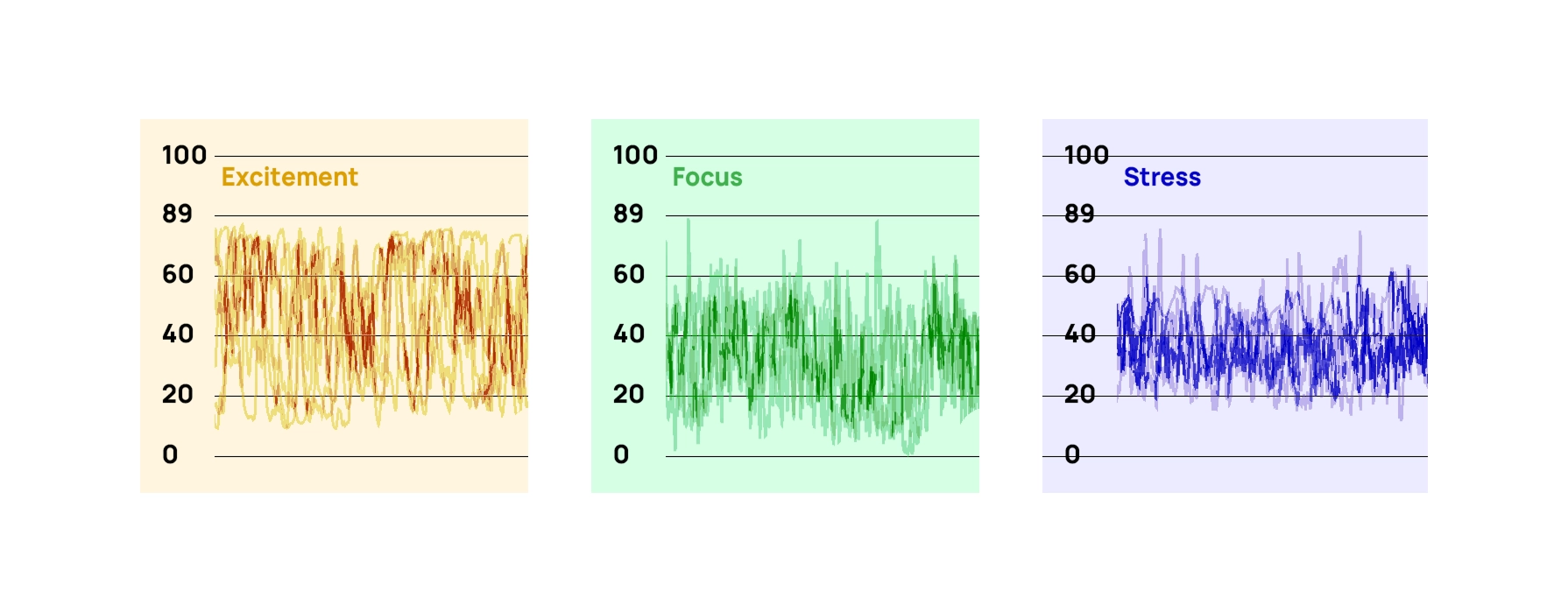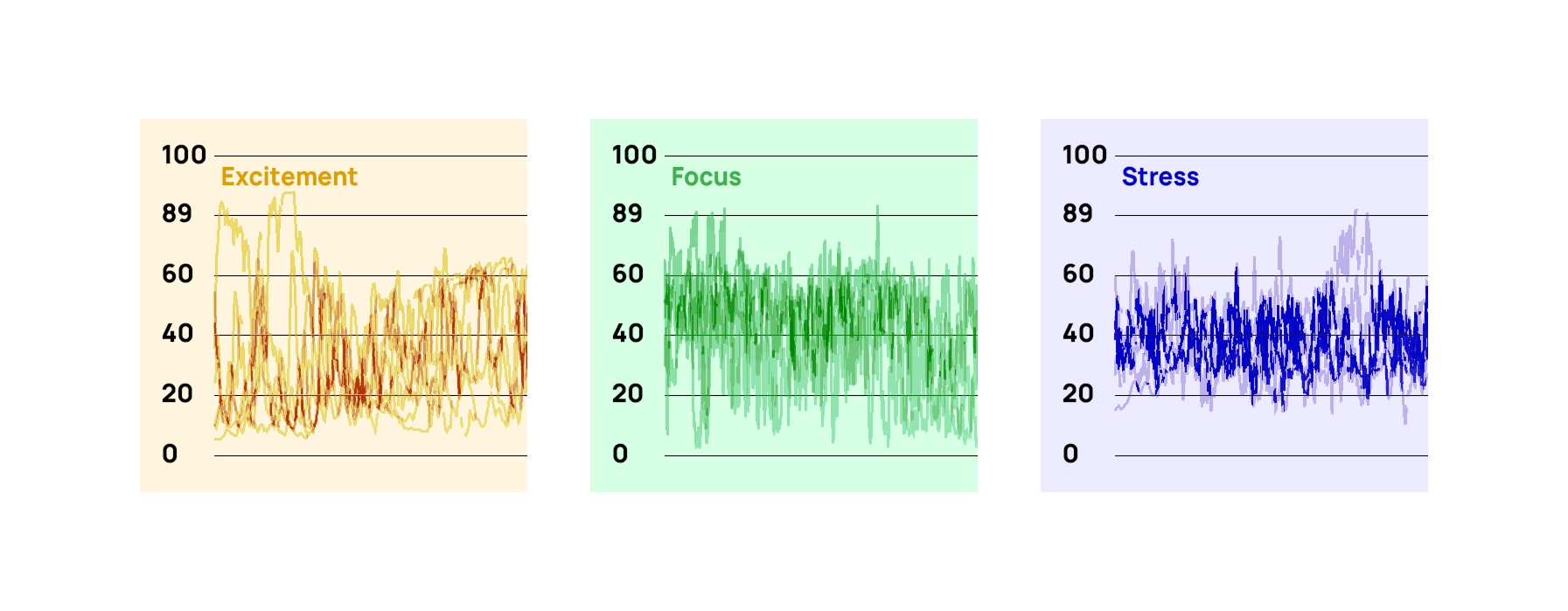 Stress levels were low and stable, suggesting the room provided a calming effect. Focus levels were high, with steady interest throughout the task. Excitement levels were moderate, indicating the environment was engaging enough to maintain attention without becoming distracting.